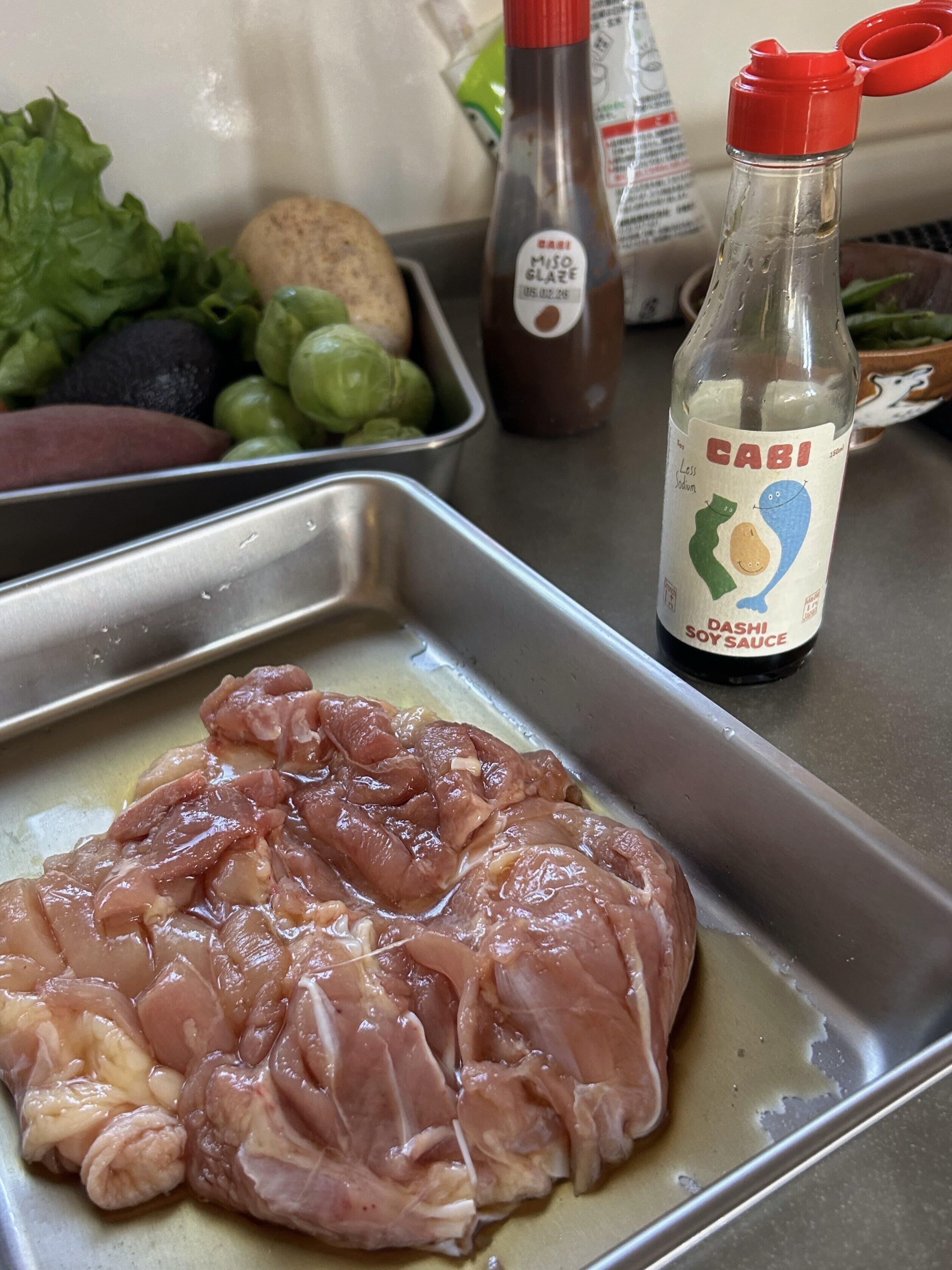 Marinate your chicken in 1 tbsp sake, 1 tbsp mirin, 1 tbsp Cabi’s soy, ½ tsp salt, and ¼ tsp white pepper for 30 minutes.