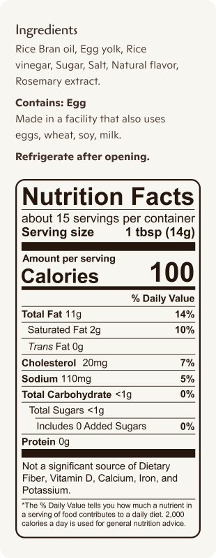 Silky and rich. Small batch from Japan with golden egg yolks and rice bran oil for clean, balanced flavor.