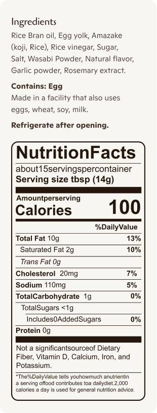 Silky with a gentle wasabi lift. Small batch from Japan with golden egg yolks and rice bran oil for fresh, clean flavor.